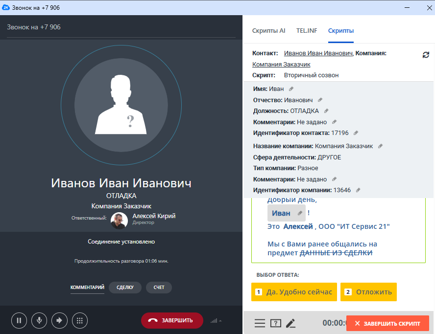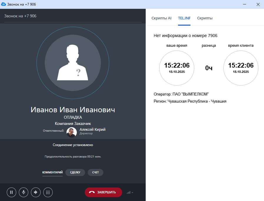 - TEL.INF - помогает нам определить регион телефона контакта, провайдера связи и его региональное время. Это позволяет нам не делать несвоевременные звонки в нерабочее время контрагента.