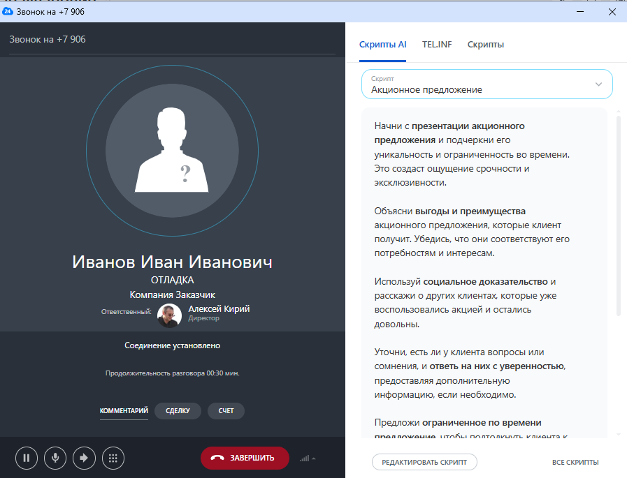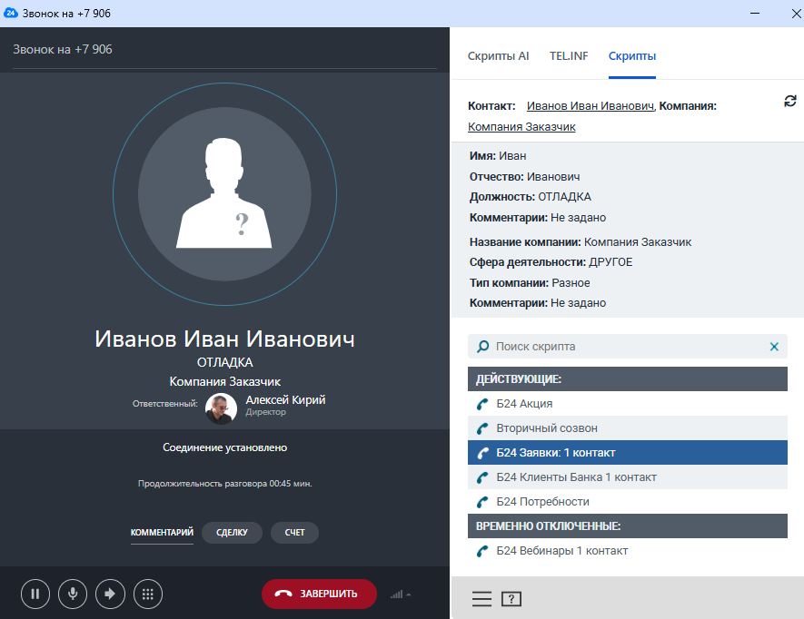 - Скрипты - содержит скрипты звонков, настроенные нами через одно из приложений Битрикс24.Маркет. Эти скрипты имеют разветвленную структуру и маршрут сценария звонка меняется в зависимости от выбранной нами ситуации.
