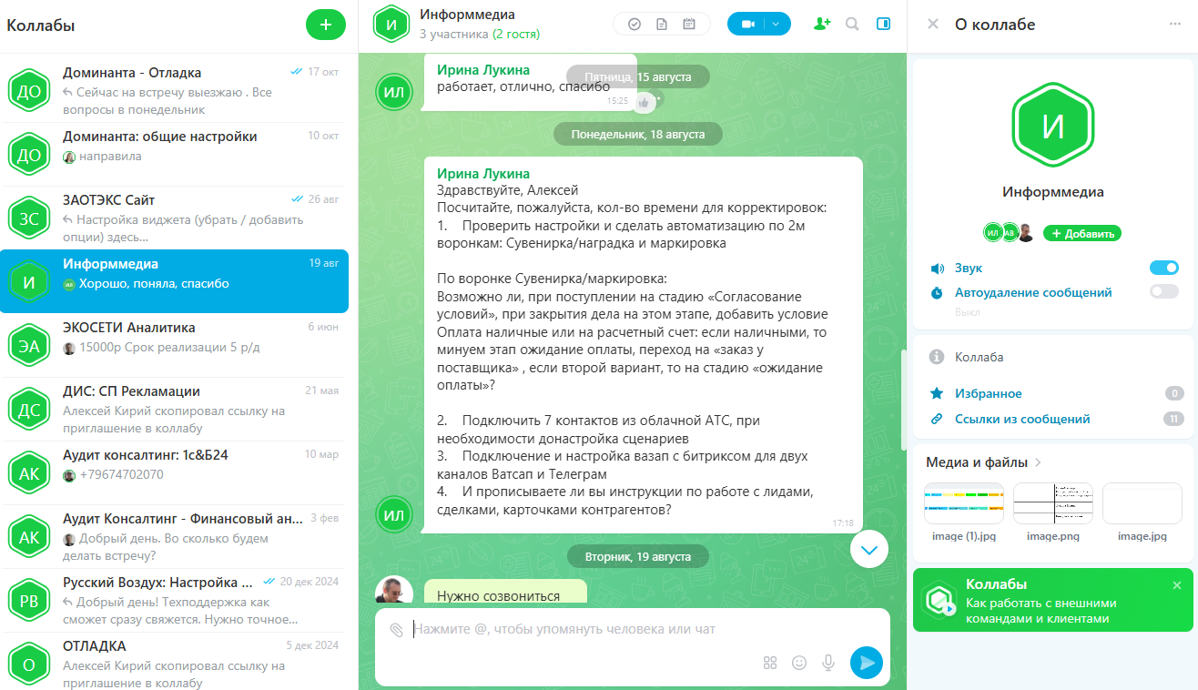 А еще можно использовать Коллабы. Это рабочие пространства для совместной работы с партнерами, подрядчиками и заказчиками, не являющимися пользователями вашего Битрикс24. В коллабах есть чат, задачи и диск только для участников коллабы.