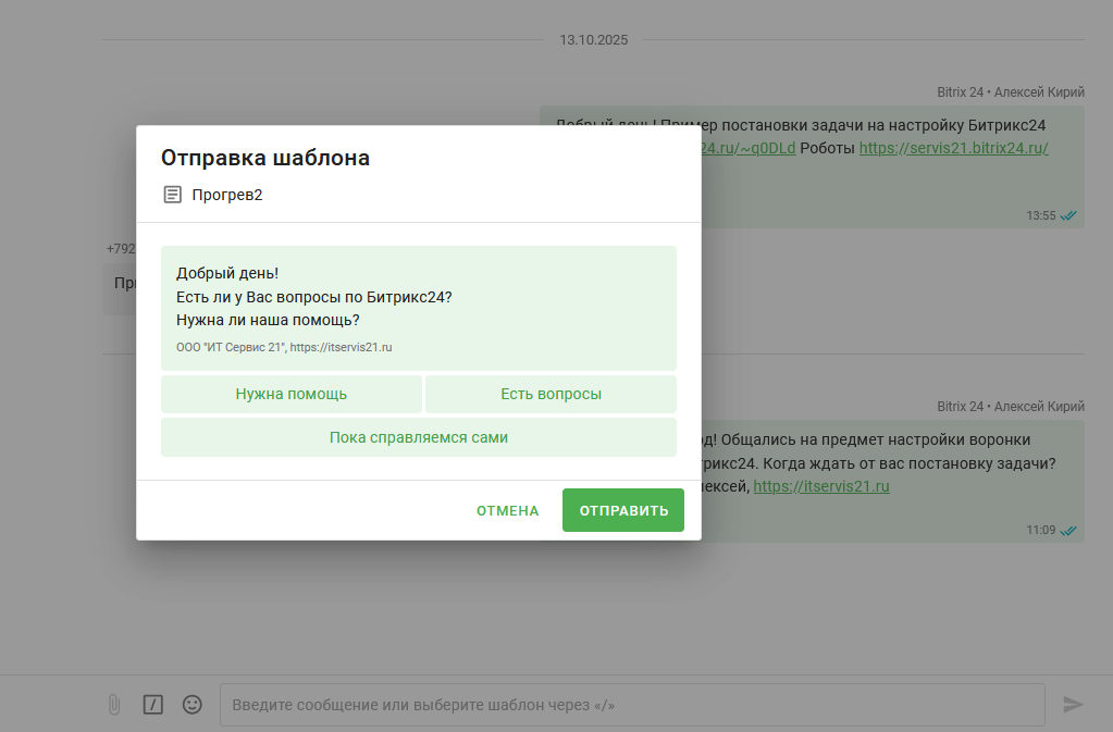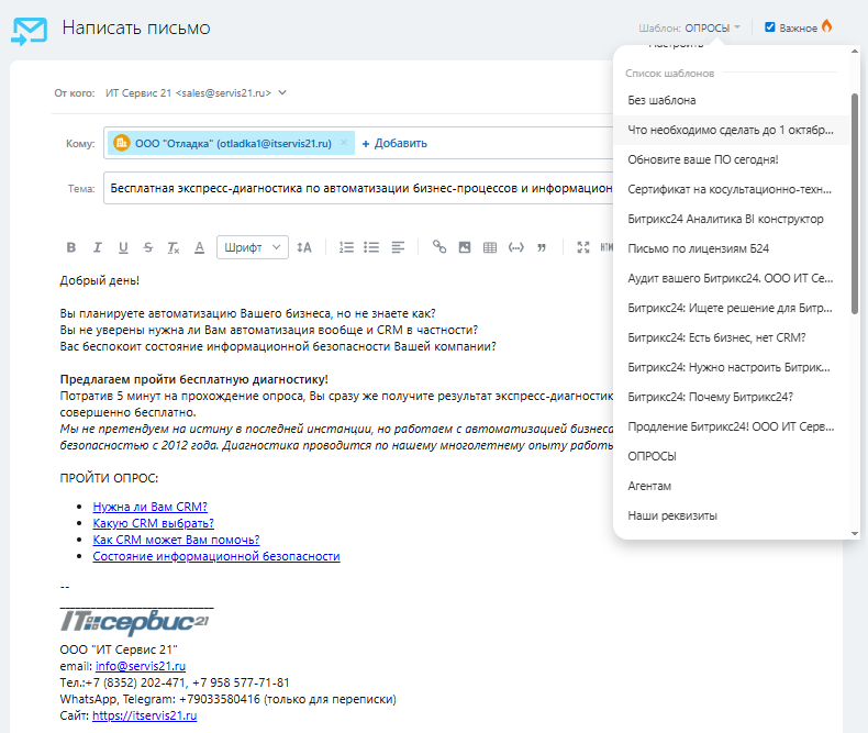 Шаблоны писем экономят наше время при подготовке сообщений. При помощи шаблона в текст письма можно подставит ФИО клиента, Имя и контактный телефон менеджера, просто статический текст.