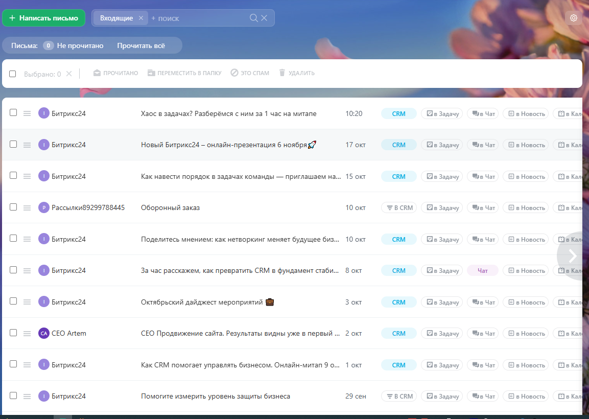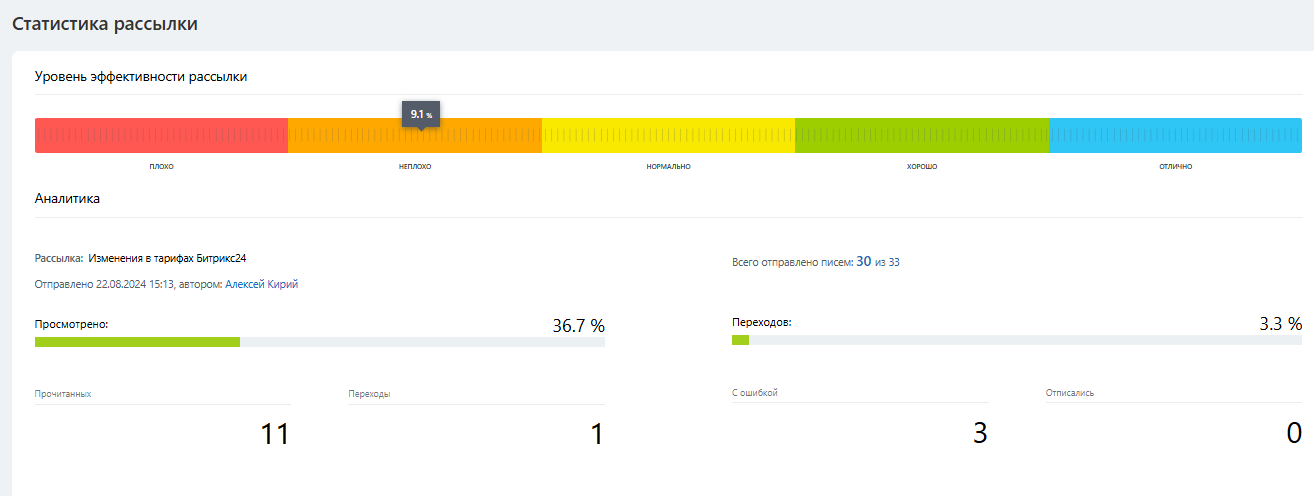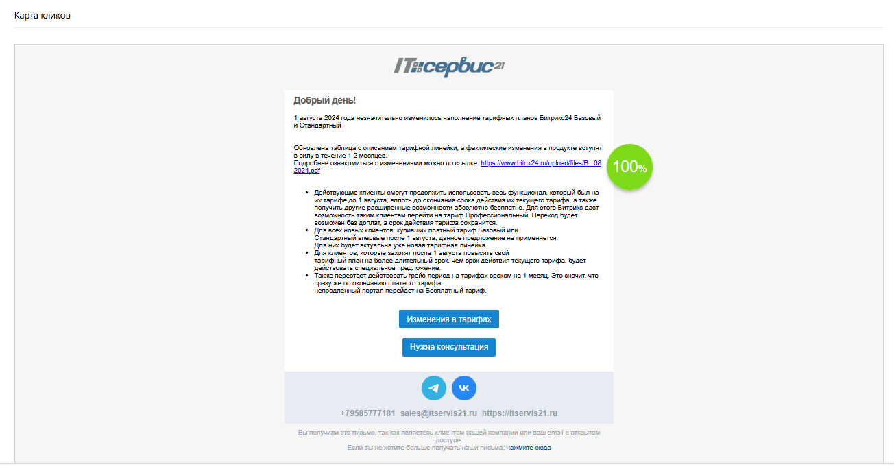 Рассылки мы делаем из Битрикс24, предварительно выбрав сегмент адресатов по нашей клиентской базе и подготовив письмо в визуальном редакторе. После того как рассылка, по заранее выставленной дате и времени, будет отправлена, мы можем посмотреть статистику просмотров письма и кликов по ссылке в тексте письма.