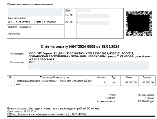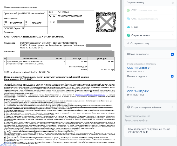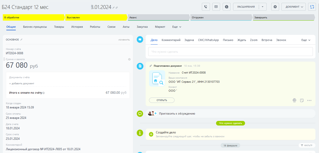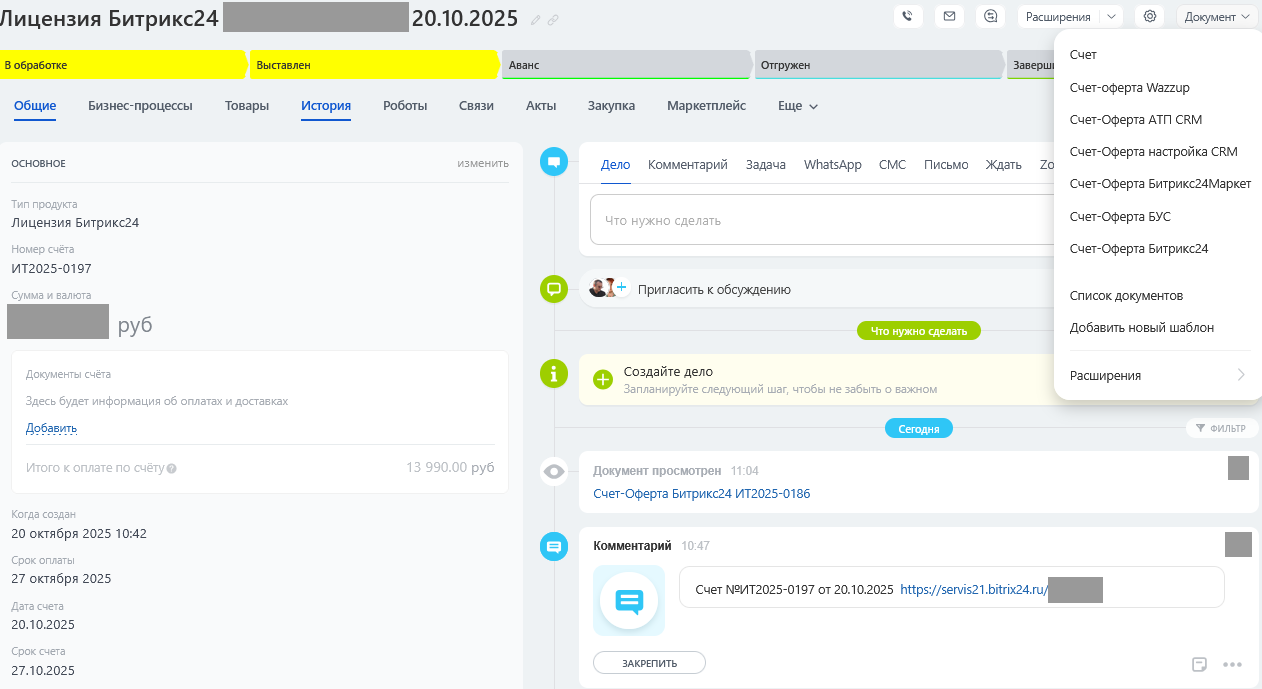 Документ счета генерируется по шаблону из карточки счета в Битрикс24 и сразу ж может быть отправлен клиенту.