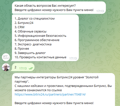 Чат-бот с выбором в меню снимал с сотрудников нагрузку, связанную с входящими простыми вопросами, выступая в качестве первой линии обработки входящих сообщений.