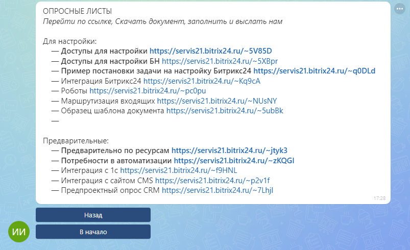 - Скрипты - содержит скрипты звонков, настроенные нами через одно из приложений Битрикс24.Маркет. Эти скрипты имеют разветвленную структуру и маршрут сценария звонка меняется в зависимости от выбранной нами ситуации.