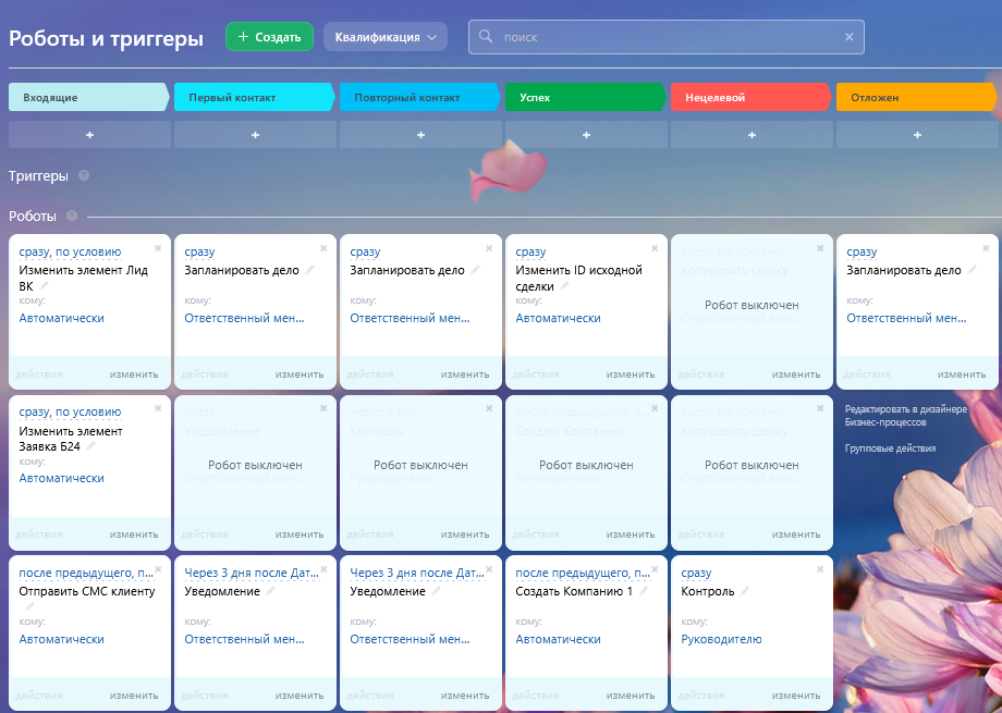 На каждой воронке настроены роботы автоматизации. Роботы напоминают сотрудникам о необходимости тех или иных действий, назначают дела и задачи с чек-листами в соответствии с нашими регламентами, отправляют напоминания клиентам об оплате счетов и, в целом, существенно экономят наше время, не давая при этом забыть о важном.