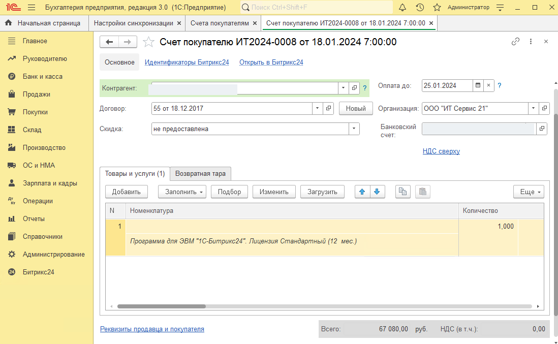 Счет мы создаем из сделки в Битрикс24. Счета, перенесенные на стадию "Выставлен", автоматически передаются в 1с с данными контрагента и товарных позиций счета.