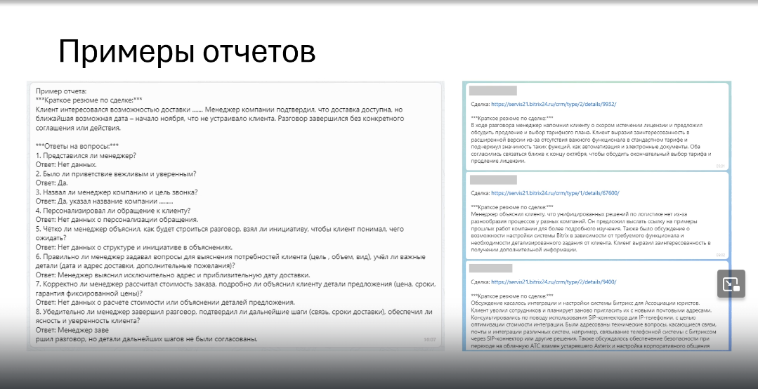 В целях контроля качества телефонных переговоров мы установили специальное приложение из Битрикс24.Маркет. Это приложение ежесуточно дает детальный отчет по телефонным переговорам, их результату, ошибках и нарушениях регламента менеджерами.