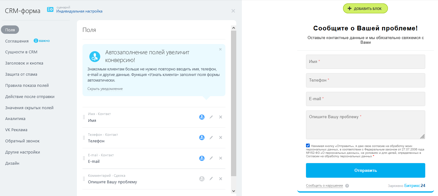 Почти на всех страницах сайта размещены CRM формы Битрикс24. При отправке формы данные сразу же поступают в CRM в ту воронку сделок, которая указана в настройках формы.