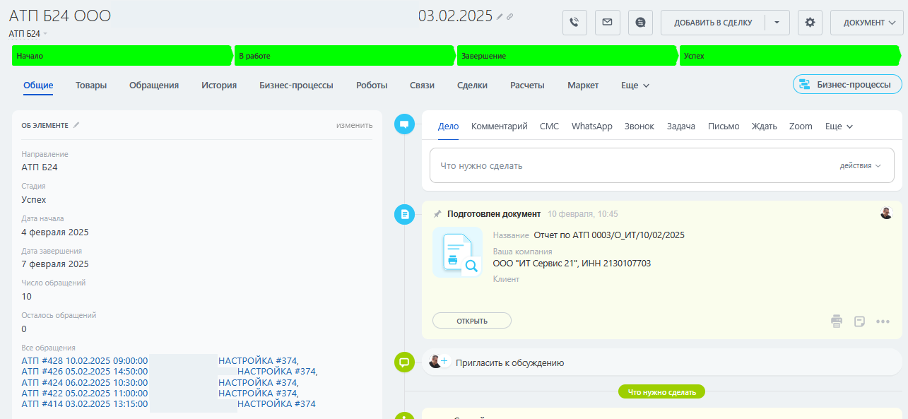 Теперь генерация документа занимает не более 2-3 минут. Документ заполняется по шаблону и информация по контрагенту, товарным позициям и прочие необходимые данные подтягиваются в документ из карточек Компаний, сделок и других элементов CRM.